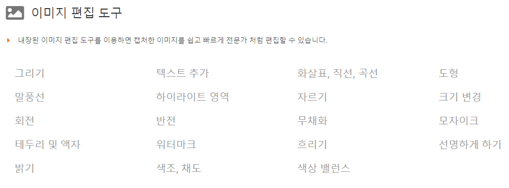 거의 그림판 + 포토샵이라고 볼 수 있는데요, 이렇게 많은 기능들을 다른 프로그램도 아니고 캡처 프로그램에서 가능하다니! 정말 전문적인 작업을 하시는 분이 아니시라면 이 프로그램으로도 충분히 쉽고, 빠르게 원하는 효과를 낼 수 있을 것 같습니다.