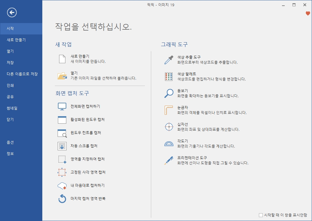 프로그램을 실행시키면 위와 같은 기본 픽픽 창이 뜨게 되는데요! 여기서 왼쪽위의 파일을 눌러주세요!