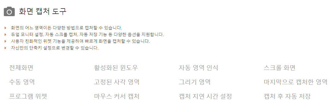 가장 중요한 캡처 도구! 화면을 캡처할 때 다양한 모드를 지원합니다. 그래서 더욱 편하게 사용자가 원하는 영역을 입맛대로 캡처 할 수 있게 해주는 프로그램입니다. 이렇게 많은 캡처 모드를 지원해주다니 정말 똑똑한 프로그램이지 않나요? 저는 딱 원하는 부분만 캡처할 수 있는 수동영역 캡처를 가장 많이 쓰는편입니다.