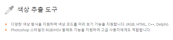 이 기능도 아주 많이 쓰이는 기능이죠! 현재 캡쳐된 이미지에서 내가 원하는 색상을 원하는 포맷으로 뽑아낼 수 있게 되어있습니다. 정말 유용한 기능이에요.