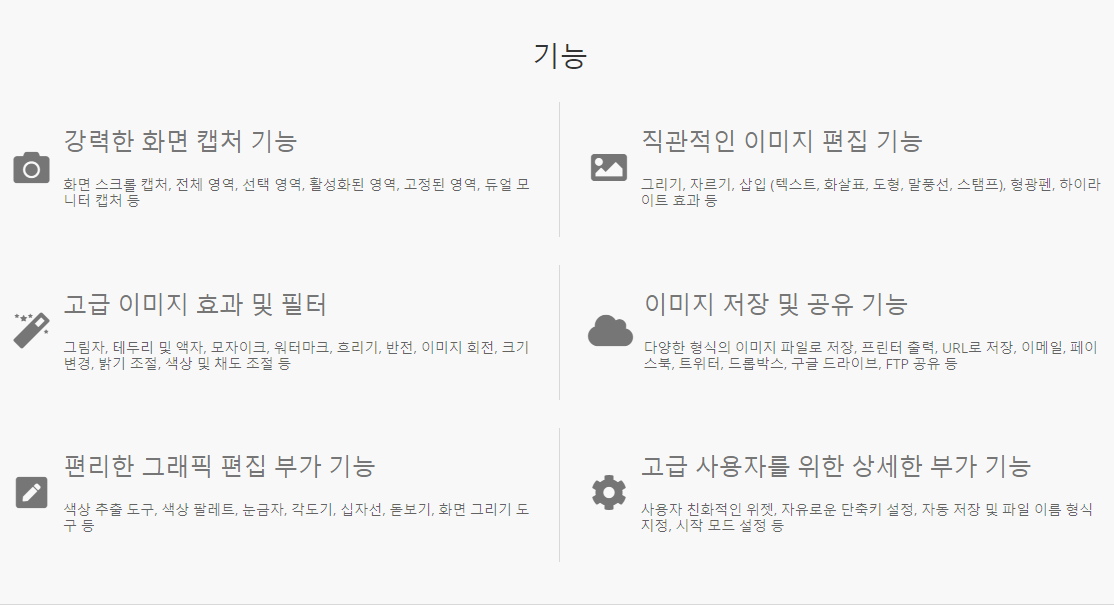 전체적으로 보면 픽픽에는 위와 같이 강력한 화면 캡처 기능, 직관적인 이미지 편집 기능, 고급 이미지 효과 및 필터, 이미지 저장 및 공유 기능, 편리한 그래픽 편집 부가 기능, 고급 사용자를 위한 상세한 부가 기능을 지원합니다. 기능만 보면 유료프로그램이라고 해도 손색이 없을정도의 기능을 보유하고 있습니다.