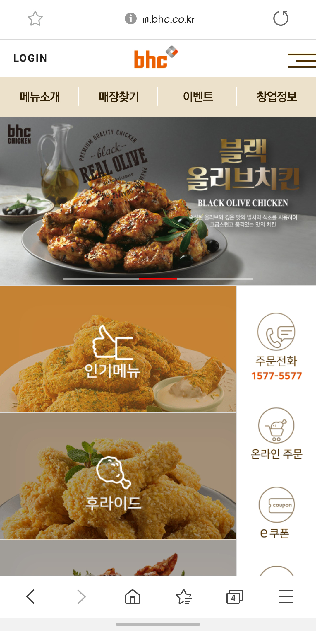 기프티콘으로 주문을 하려면 가장먼저 bhc 공식홈페이지에 들어갑니다. (http://www.bhc.co.kr/) 홈페이지에 들어가시면 왼쪽 배너부분에 e쿠폰주문 을 클릭해줍니다. ( https://online.bhc.co.kr/order/orderSelect.do ) 바로 들어가시려면 왼쪽의 주소를 눌러주세요. ( 모바일버전은 오른쪽 아래부분에 e쿠폰 이라는 배너를 클릭해주세요 )