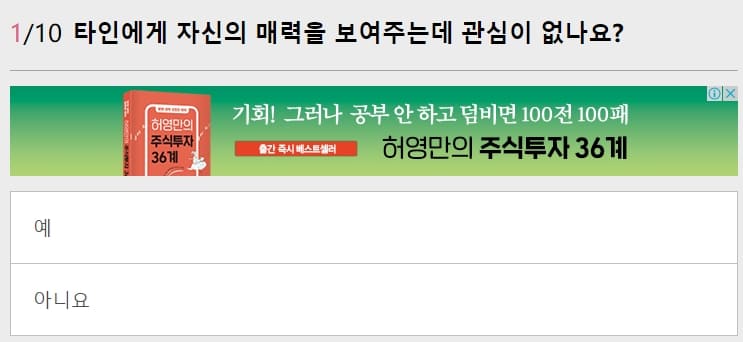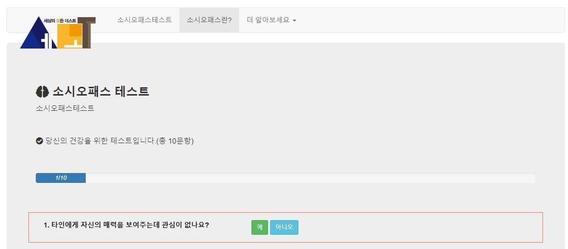 골드사주 사이트의 소시오패스 테스트는 위의 봉봉과 세모테와는 달리 문항수는 10문항으로 같지만 질문이 약간 다릅니다. 제가 직접 진행해본 결과 결과도 조금 더 의미있는 결과인것 같습니다! 광고는 존재하지만 중간에 하나밖에 없어서 테스트를 진행하는데 크게 신경쓰이지는 않는 정도입니다만 처음에 사이트에 들어가면 팝업광고가 존재합니다