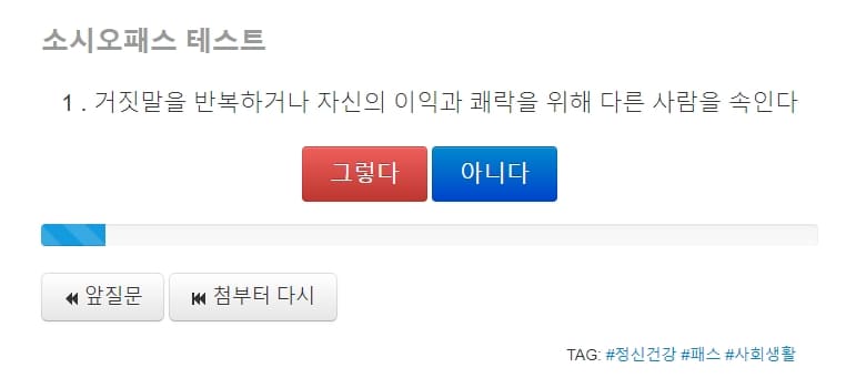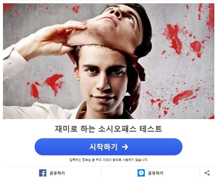 이상으로 소시오패스 테스트 사이트들을 알아보았습니다. 소시오패스 테스트를 한다고 해도 전문의에게 상담받는 것이 아닌 인터넷에 올라와있는 테스트로 너무 진지하게 받아들이지는 마세요! 가벼운 마음으로 테스트한번 해보시는것이 어떨까요?