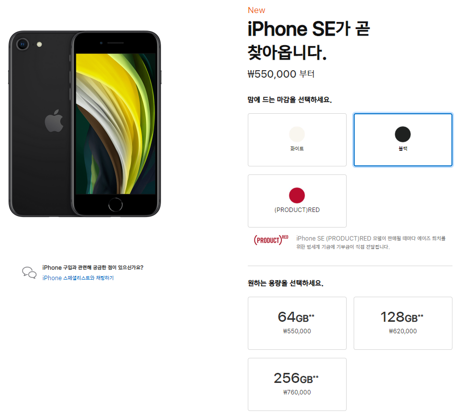 아이폰SE라면 중저가의 아이폰인데 정말 중요한 가격을 알려드리겠습니다. 아이폰SE의 가격은 64GB 가 550,000원 128GB 가 620,000원, 256GB 가 760,000원으로 책정되었습니다. 가장 인기 있는 아이폰이고 물론 저가형이라고는 하지만 최신 A13 바이오 프로세스가 탑재되어있는 아이폰SE가 550,000원 이면 굉장히 경쟁력 있는 가격인 것 같습니다.