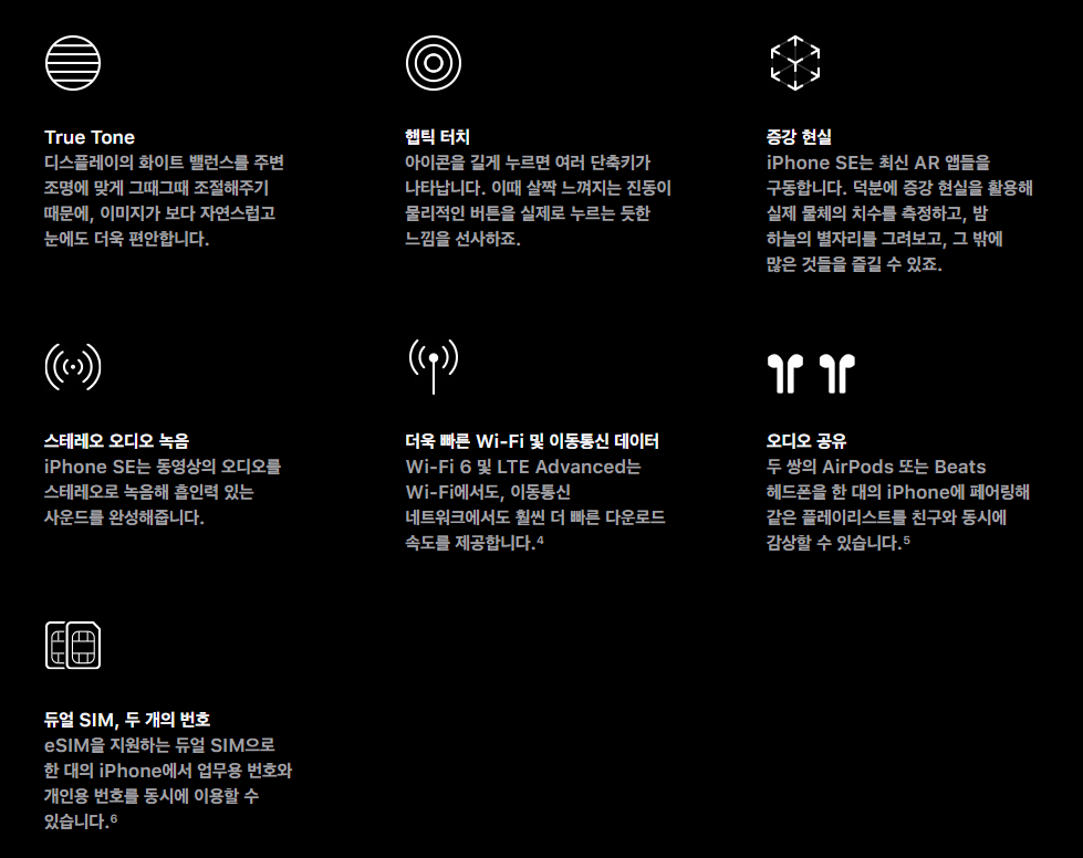 아이폰SE는 위에서 언급한 메인기능 말고도 디스플레이의 화이트 밸런스를 주변 조명에 조절해주는 True Tone 기능, 햅틱 터치, 증강 현실, 스테레오 오디오 녹음, Wi-Fi 6, 오디오 공유, 듀얼 SIM 기능을 지원합니다.