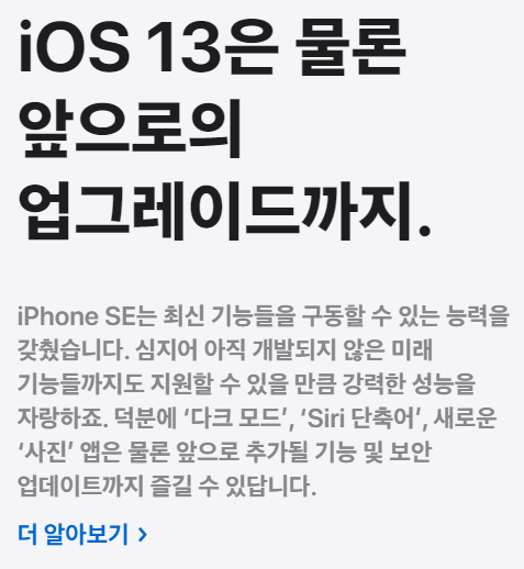 아이폰SE는 기본적으로 iOS 13을 탑재하고 앞으로의 업그레이드도 지원합니다. 물론 어느정도가 지나면 한계는 있겠지만 그래도 SE를 충분히 쓸만큼은 지원해주지 않을까 하고 생각합니다.