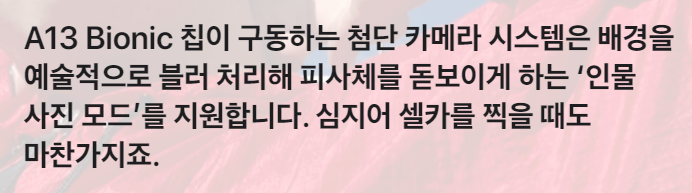 아이폰se의 카메라는 후면 1200만 화소, 전면 700만 화소의 각각 싱글 카메라를 가졌으며 여기서 주목해야 할 점은 아이폰se 에도 이제 '인물 사진 모드'가 지원된다는 것입니다. A13 칩의 빠른 연산능력을 이용해 인물사진 모드를 지원하는 점은 또 한 번 아이폰 업그레이드를 꼭 해야 하는 이유가 되는 부분입니다. 많은 아이폰 유저들이 사진 기능을 중요시 여기는데 아이폰 SE는 그 점을 정확히 캐치해낸 것 같습니다.